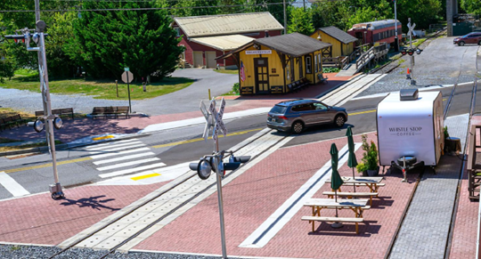 In addition to ongoing maintenance and restoration work, the railroad finished its largest project ever in 2025. The crossing at Pennsylvania Avenue and the landscaping around our station and museum building received a major facelift! This included a friendlier pedestrian walkway and new signals protecting both the traffic and the pedestrians. The Town of Walkersville helped create a “pocket park” next to the station, and a brick gathering area was added across the street.
